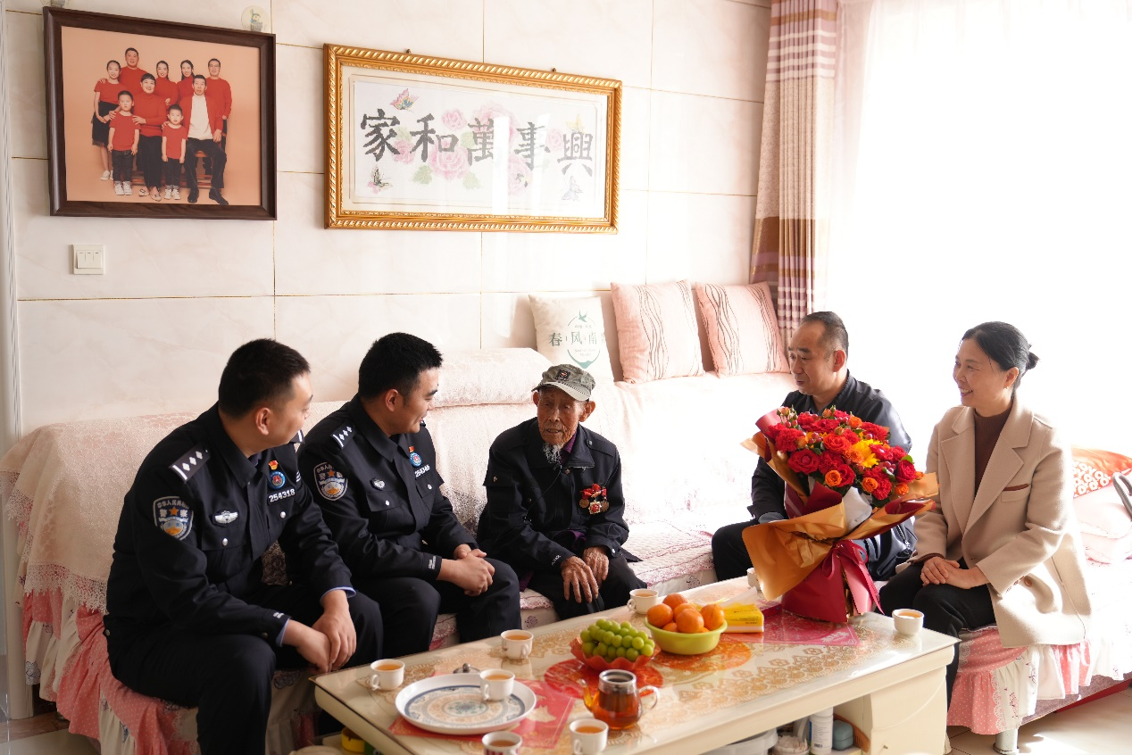 祭奠活動結(jié)束后,民警代表來到革命前輩尹光啟家中,聽前輩講述那段轟轟烈烈的抗戰(zhàn)故事。
