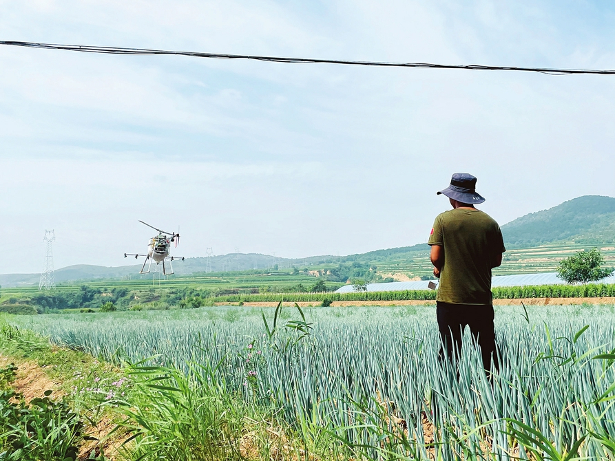 潞城大蔥種植基地,專業(yè)人員操作無人機進行殺蟲藥噴灑工作