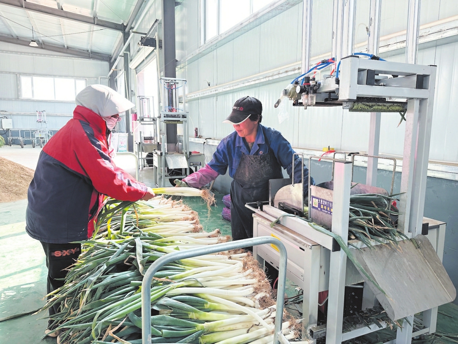 山西云巖山生態(tài)農業(yè)有限公司的大蔥加工車間,工人們正在用氣槍吹掉“毛蔥”上的泥土