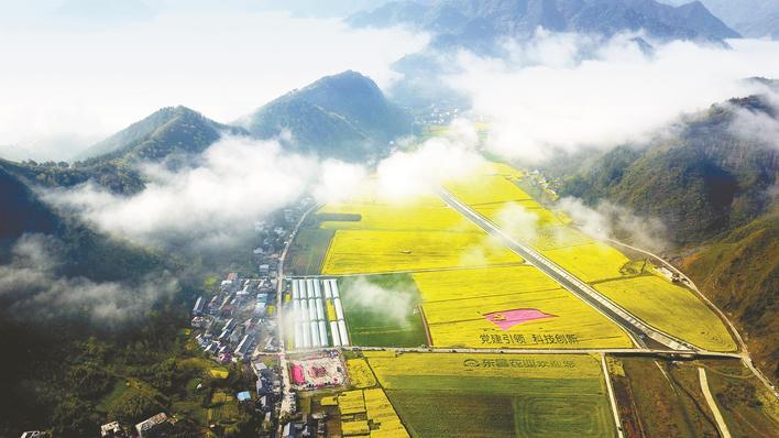 霧氣籠罩下的鄖陽區(qū)五峰鄉(xiāng)東峰村油菜花海