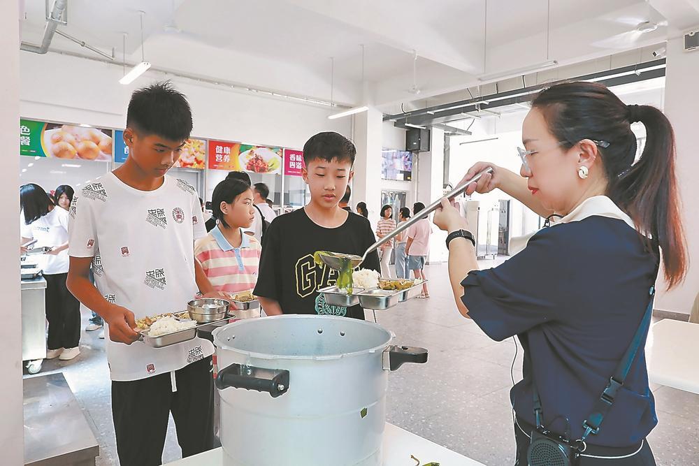 九年(2)班的學(xué)生黃禹鑫和同學(xué)拿起餐盤,到窗口排隊打飯菜,一名值日老師已經(jīng)幫他們舀好了海帶排骨湯。肉末蒸蛋、腐竹炒肉、青椒炒肉、炒白菜……吃著葷素搭配的午餐,黃禹鑫說:“我在學(xué)校食堂已經(jīng)這樣吃了兩年多,菜色很多,味道也不錯?!?/p>