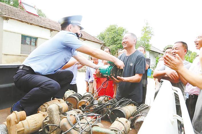 沙洋警方將近日破獲的系列盜竊農(nóng)田水泵案中追回的12個(gè)水泵返還給村民