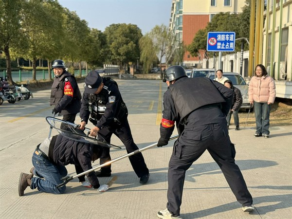 演練期間,一名佯裝以探視幼兒為借口的“歹徒”,手持器械妄圖強(qiáng)行闖入校園。面對這一“不速之客”,校園保安迅速反應(yīng),當(dāng)即對歹徒予以勸阻,并即刻啟動一鍵報警系統(tǒng)向公安機(jī)關(guān)報警,同時向園內(nèi)應(yīng)急指揮部匯報情況。相關(guān)責(zé)任教師在警報拉響后,迅速且有條不紊地將正在戶外開展活動的幼兒疏散至安全地帶。應(yīng)急小組、校園保安與在場民警緊密協(xié)作,運(yùn)用防暴盾牌筑起堅固防線進(jìn)行格擋防御,借助鋼叉巧妙干擾歹徒的行動。憑借彼此間的高度默契配合,逐步縮小對歹徒的包圍圈。在全體現(xiàn)場人員的齊心協(xié)力之下,最終成功將歹徒制服。整個演練流程各個環(huán)節(jié)緊密銜接、有條不紊,順利達(dá)成預(yù)期目標(biāo)。