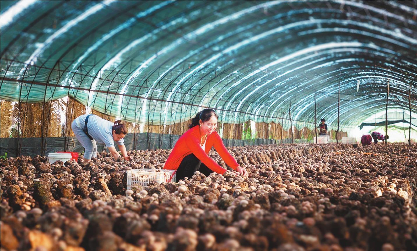 黃土嶺鎮(zhèn)的食用菌生產(chǎn)大棚內(nèi),村民們?cè)诓烧愎?/span>