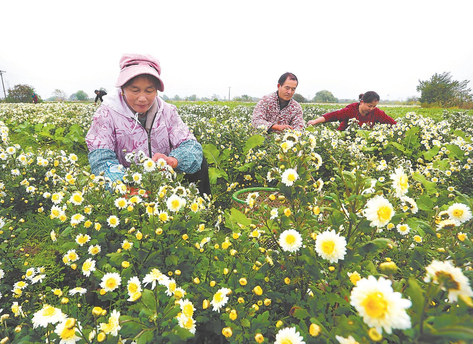 蕪湖三山經(jīng)濟開發(fā)區(qū)峨橋鎮(zhèn)農莊村村民在采收菊花 通訊員 王玉實 攝