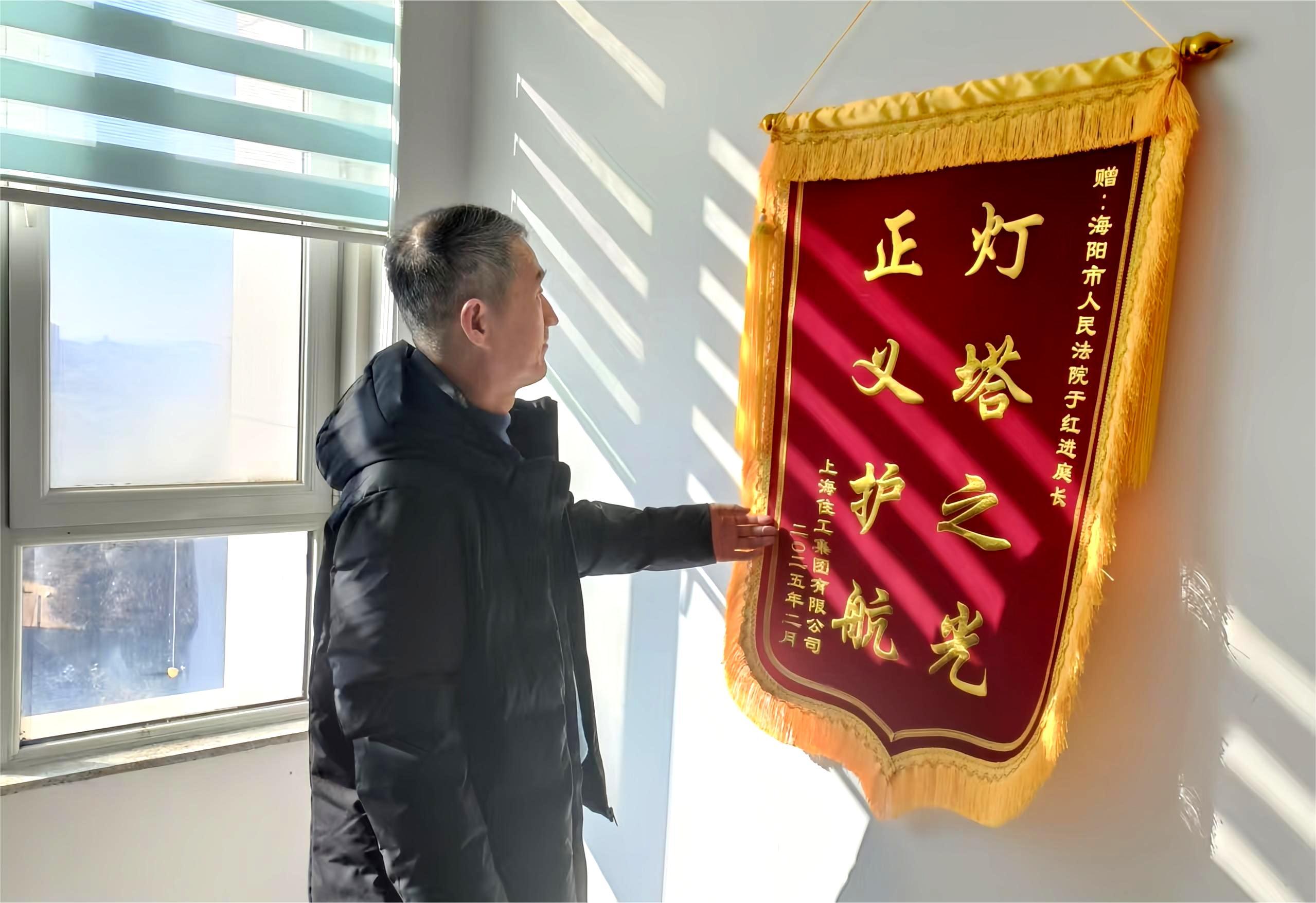 2月12日是正月十五元宵節(jié),上午10時,陽光很暖,正正地灑落在山東省海陽市人民法院民一庭辦公室的那面錦旗上,庭長于洪進合上卷宗,看著剛剛郵寄來寫有“燈塔之光 正義護航”字樣的錦旗,思緒也跟著回到了年前的臘月二十七。