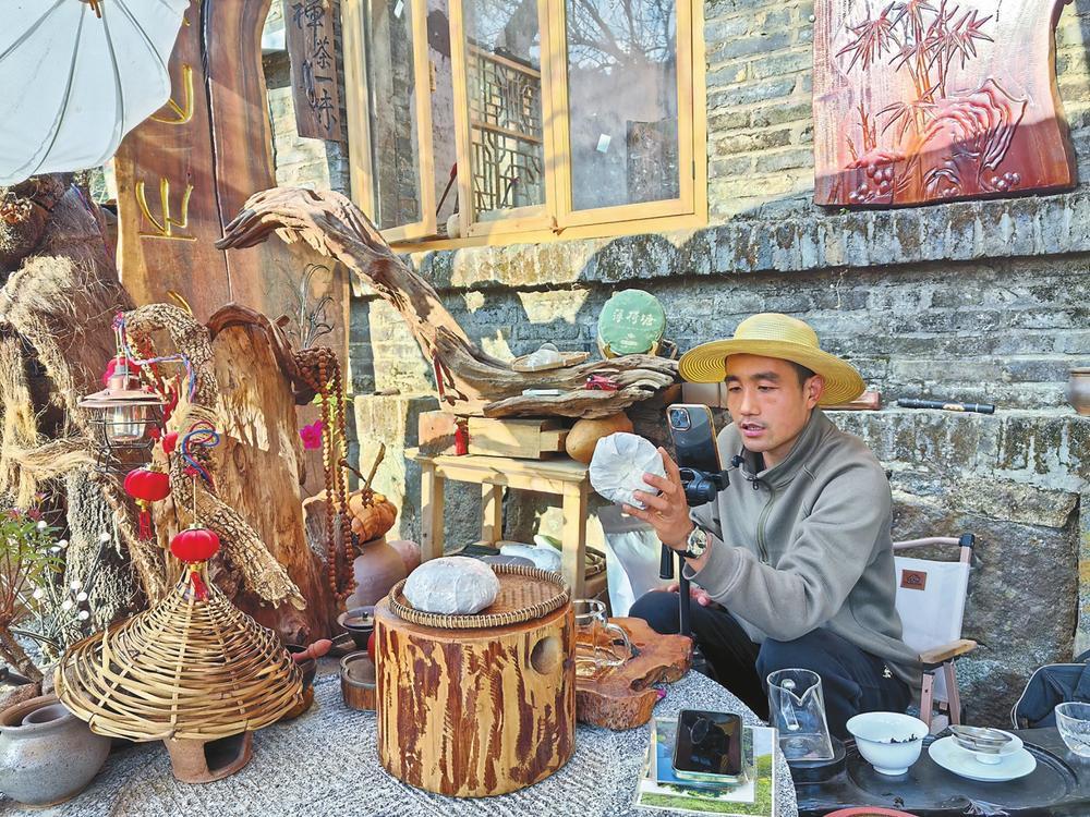 大乖來自陜西西安,是旅游愛好者。2022年,他通過網(wǎng)友介紹來到白云村,被這里“遠上寒山石徑斜,白云生處有人家”的詩意景致吸引,便決定旅居于此?!斑@里不僅風(fēng)景如畫,還有茶葉、核桃、蜂蜜等土特產(chǎn)。我是主播,既然住下來,就想幫村民通過直播增收?!贝蠊缘南敕ǖ玫酱濉皟晌钡闹С?。他與團隊一起修繕村內(nèi)的“禪茶小院”,用于短視頻拍攝,又把老電站舊址改造成簡易直播間,讓古樸的村莊刮起一場“電商風(fēng)暴”。