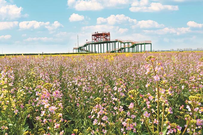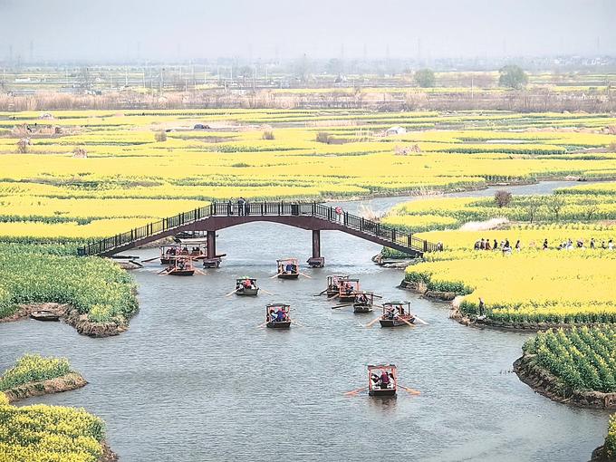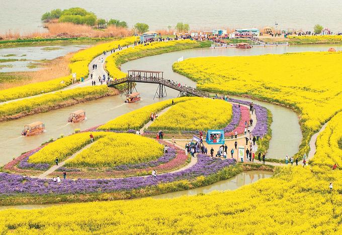 在蘇中,興化、高郵、如皋三市都不約而同“偏愛”油菜花。在興化千垛景區(qū),萬畝垛田花海演繹“河有萬灣多碧水,田無一垛不黃花”;在高郵湖上花海,“半城花海半城詩”的獨(dú)特景觀,吸引了眾多游客;在如皋平園池村,五彩油菜花好似打翻春日“調(diào)色盤”……