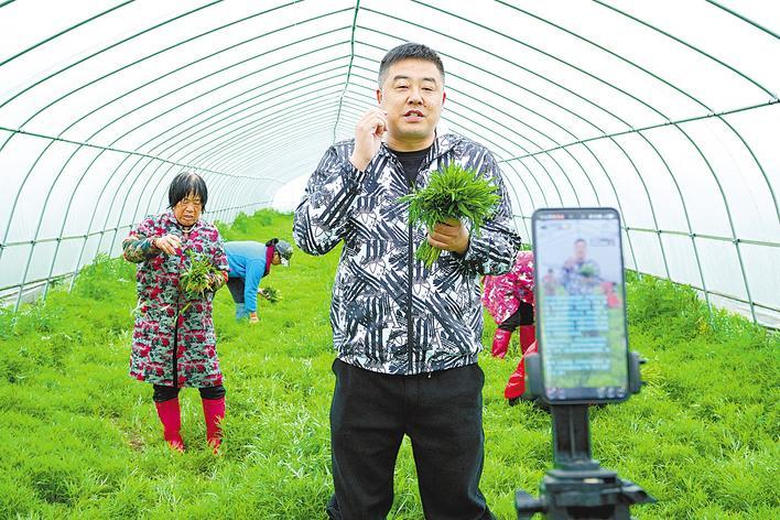 上午8點,劉勇拿起一捆2斤重的藜蒿在手機面前吆喝起來,當(dāng)天賣出3000多斤新鮮藜蒿。