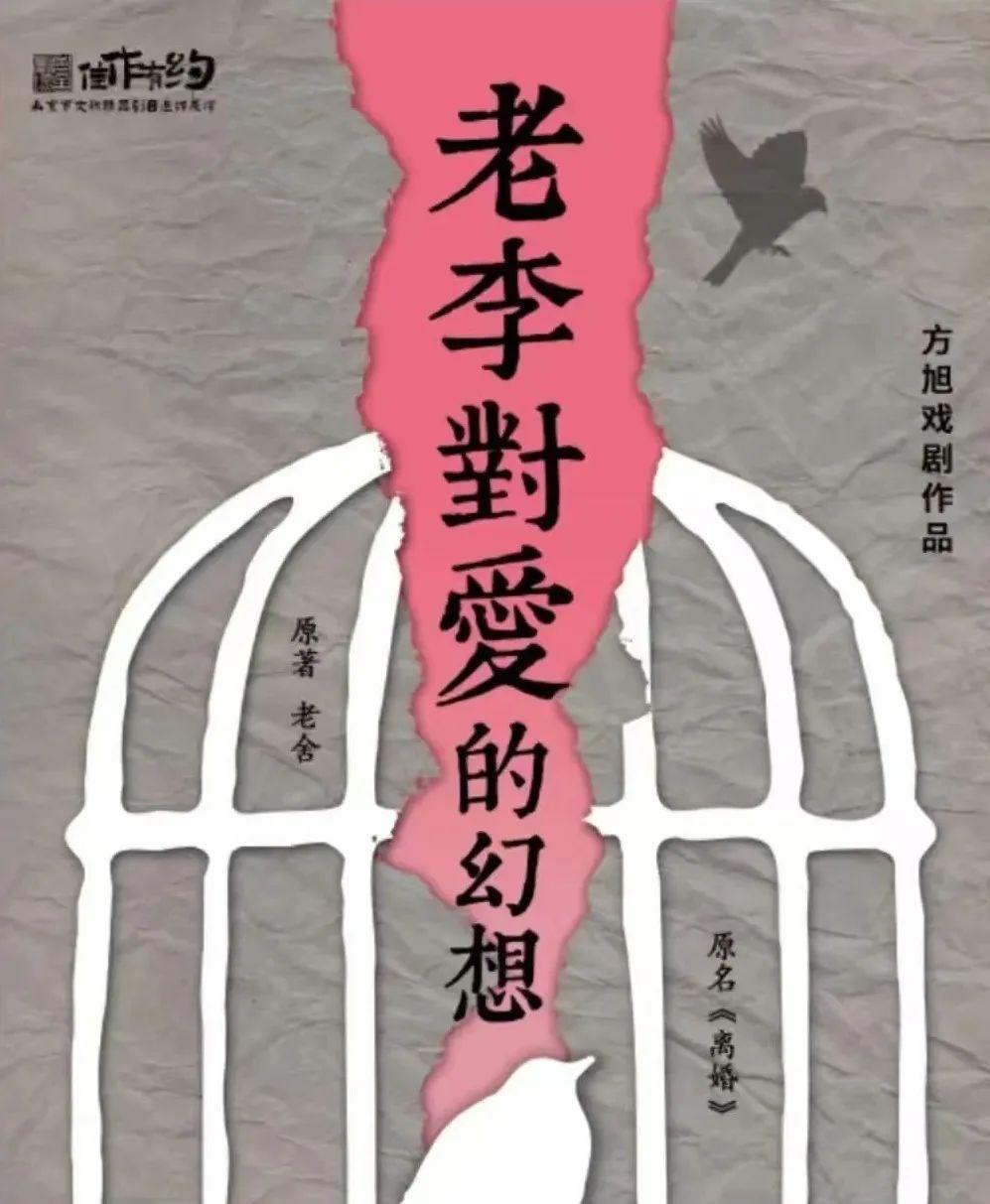 2025年3月末,由方旭、郭笑主演的話劇《老李對愛的幻想》在北京老舍劇場成功展演。該劇改編自老舍同名長篇小說《離婚》,講述主人公小“智識”分子老李掙扎于詩意幻想和庸俗實際,在傳統(tǒng)和變革進退兩難的苦悶中,經(jīng)由一起“政治”暗殺促成自我蛻變的無奈故事。劇中著力表現(xiàn)民國離婚鬧劇風(fēng)潮下,小市民的情感困境及文化心態(tài),正如老李的舞臺形象:一身灰色長衫,圍著藍色圍巾——灰藍色在老舍筆下是“最不得人心的”,因為“一遇上陽光管保只剩下灰,一點也不藍”。