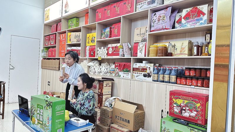 4月6日,馬余余(左)正在直播間賣村里的手工空心掛面。