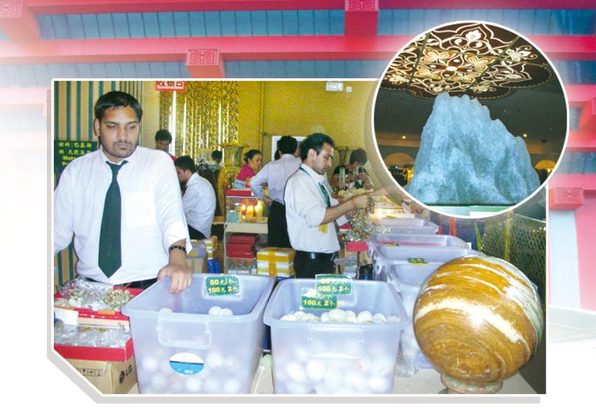 在2010上海世博會巴基斯坦館內,可見形態(tài)各異的玉石作品。右上為“假山”。馬霞 攝