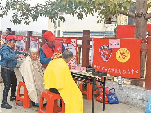 興龍街道平浪村志愿者服務(wù)隊(duì)在老區(qū)廣場(chǎng)開展愛心義剪。(長(zhǎng)洲區(qū)融媒體中心供圖)