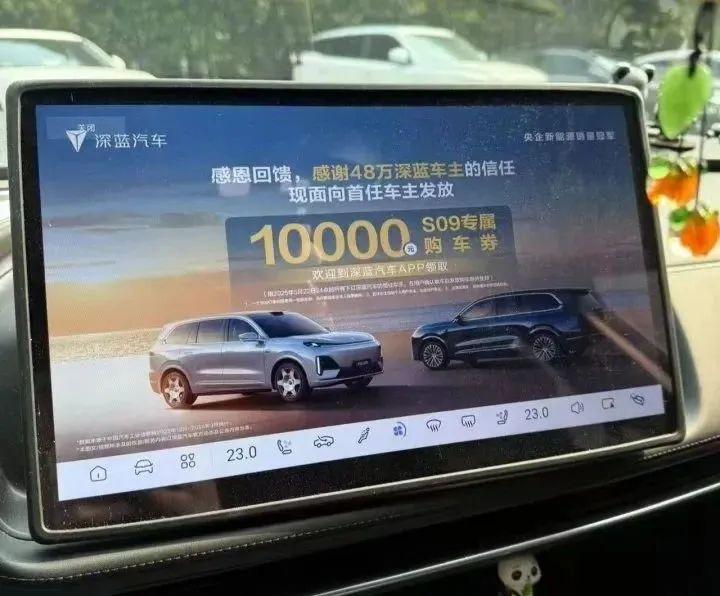 日前,多位深藍(lán)汽車車主公開吐槽稱,深藍(lán)汽車在沒經(jīng)過車主同意的情況下在汽車中控大屏幕投放廣告。廣告顯示“感謝48萬深藍(lán)車主的信任,現(xiàn)面向首任車主發(fā)放10000元專屬購車券”。