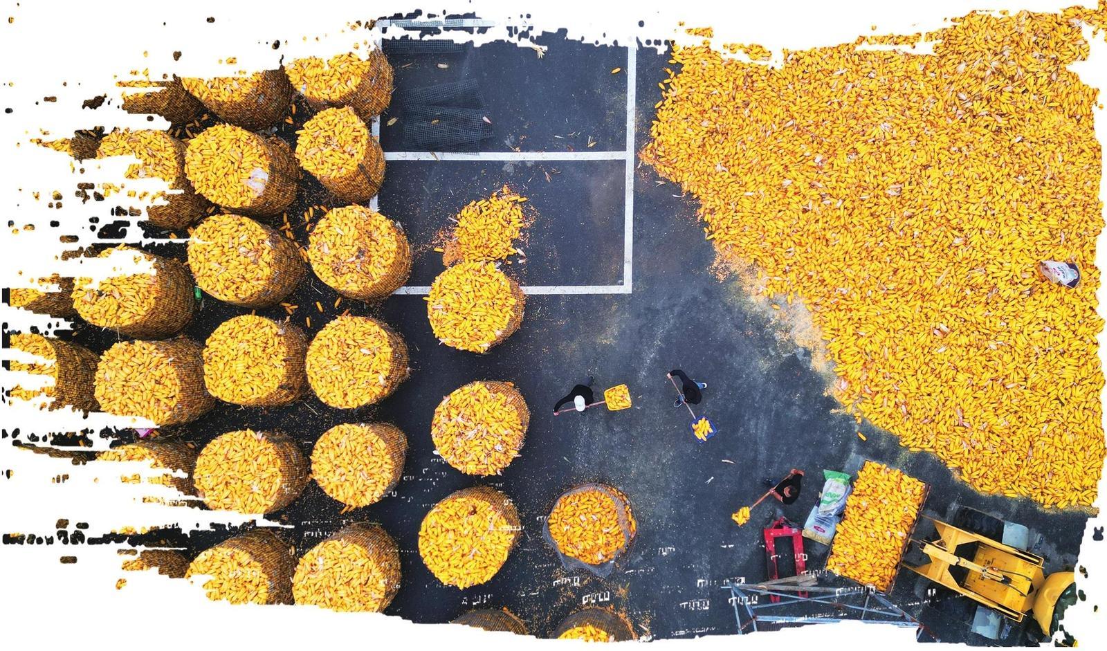 梨樹縣盧偉農(nóng)機(jī)農(nóng)民專業(yè)合作社社員在晾曬玉米。趙晶 航拍
