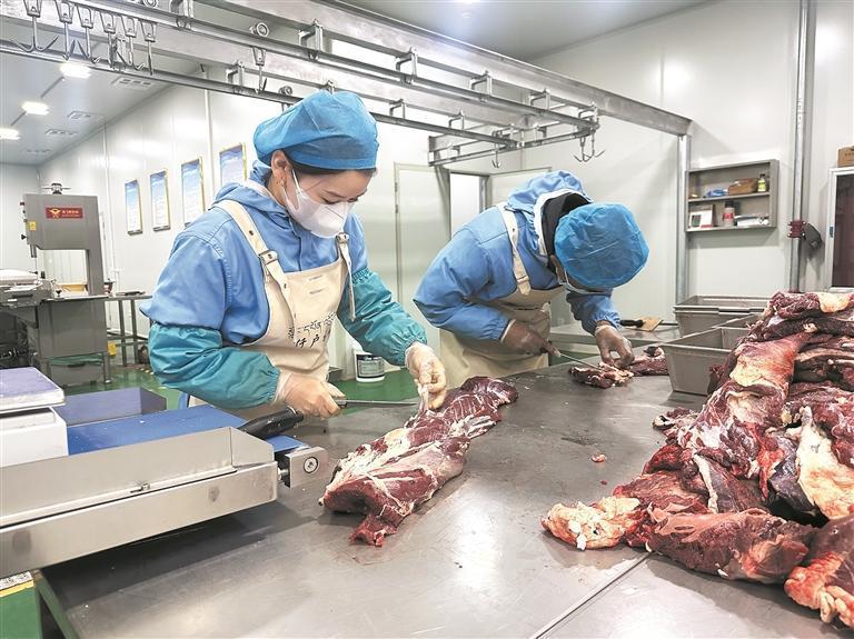 “一只成年藏羊在經(jīng)過檢疫達(dá)標(biāo)屠宰后,先送至排酸間用保鮮排酸技術(shù)進(jìn)行排酸,再被送進(jìn)這里分割加工、剔骨、修割?!鼻獞裟翀?chǎng)加工車間工作人員馬玉梅介紹說。只見她手持專用刀具,沿著羊肉的肌肉紋理精準(zhǔn)下刀,將藏羊按部位分割成精品羊肋排、羊腿肉(帶骨)、羊脖片等不同區(qū)塊。隨后,新鮮的藏羊肉被快速分揀至不同區(qū)域,有的進(jìn)入真空包裝機(jī)完成封裝,有的則被送往進(jìn)一步加工的流水線。車間里機(jī)器運(yùn)轉(zhuǎn)的低鳴聲與工作人員專注的動(dòng)作交織,每一個(gè)環(huán)節(jié)都嚴(yán)格遵循衛(wèi)生標(biāo)準(zhǔn),確保肉類從分割到成品的全程安全。