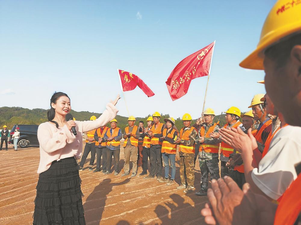 在明溪縣胡坊互通建設(shè)工地上,“遠(yuǎn)山三人行”文藝志愿服務(wù)隊把歡歌笑語帶到筑路工人身旁。