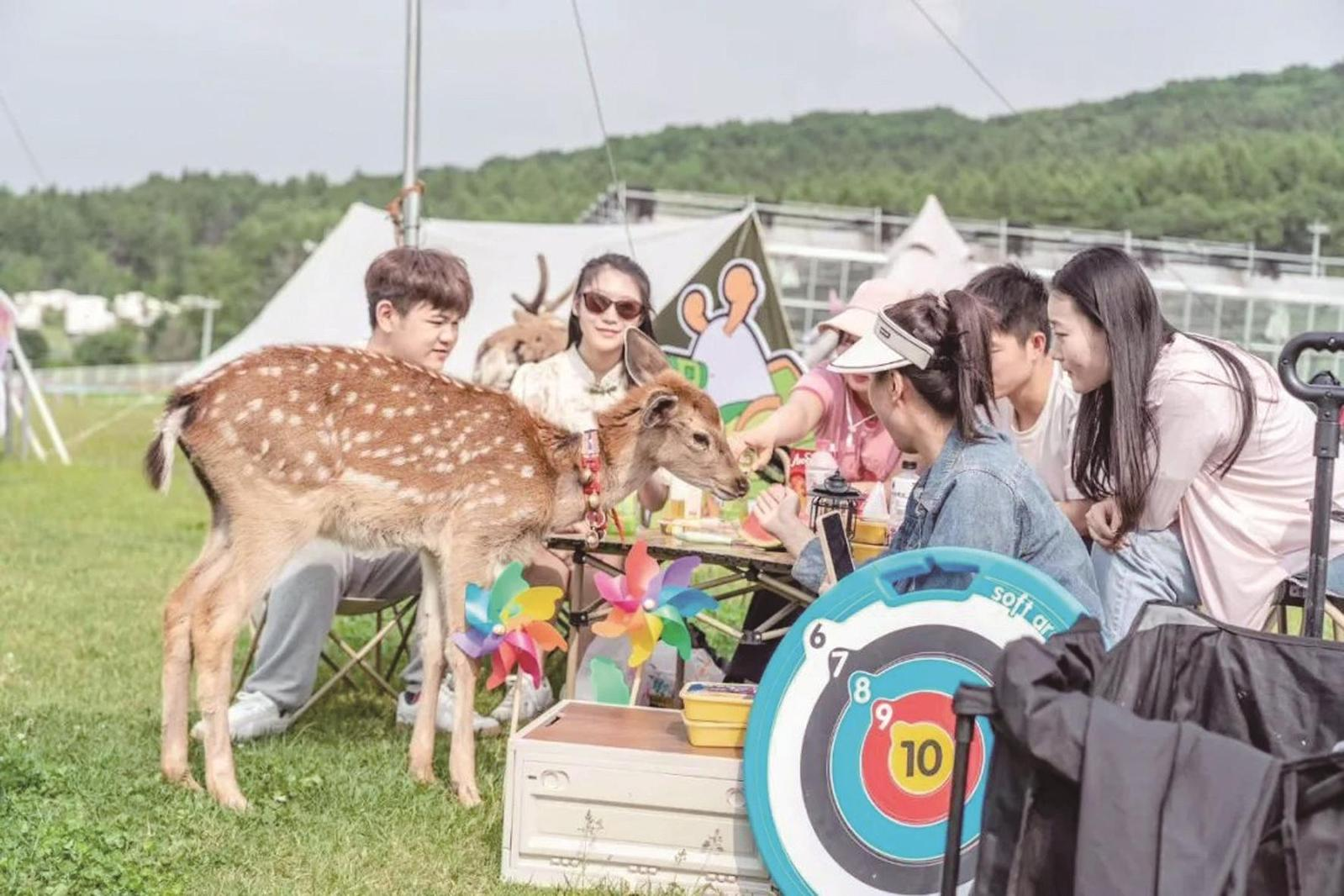 在長(zhǎng)春市雙陽區(qū)神鹿峰景區(qū),游人與景區(qū)梅花鹿互動(dòng)。