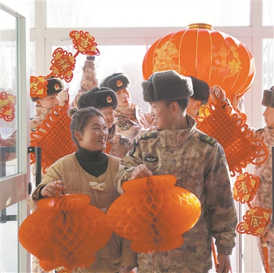 王萬果夫婦與連隊(duì)官兵一起貼春聯(lián)、掛燈籠,營造節(jié)日喜慶氛圍。