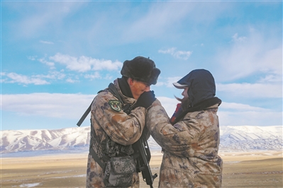 巡邏途中休息時(shí),宣偉為妻子歐陽冬梅焐手取暖。