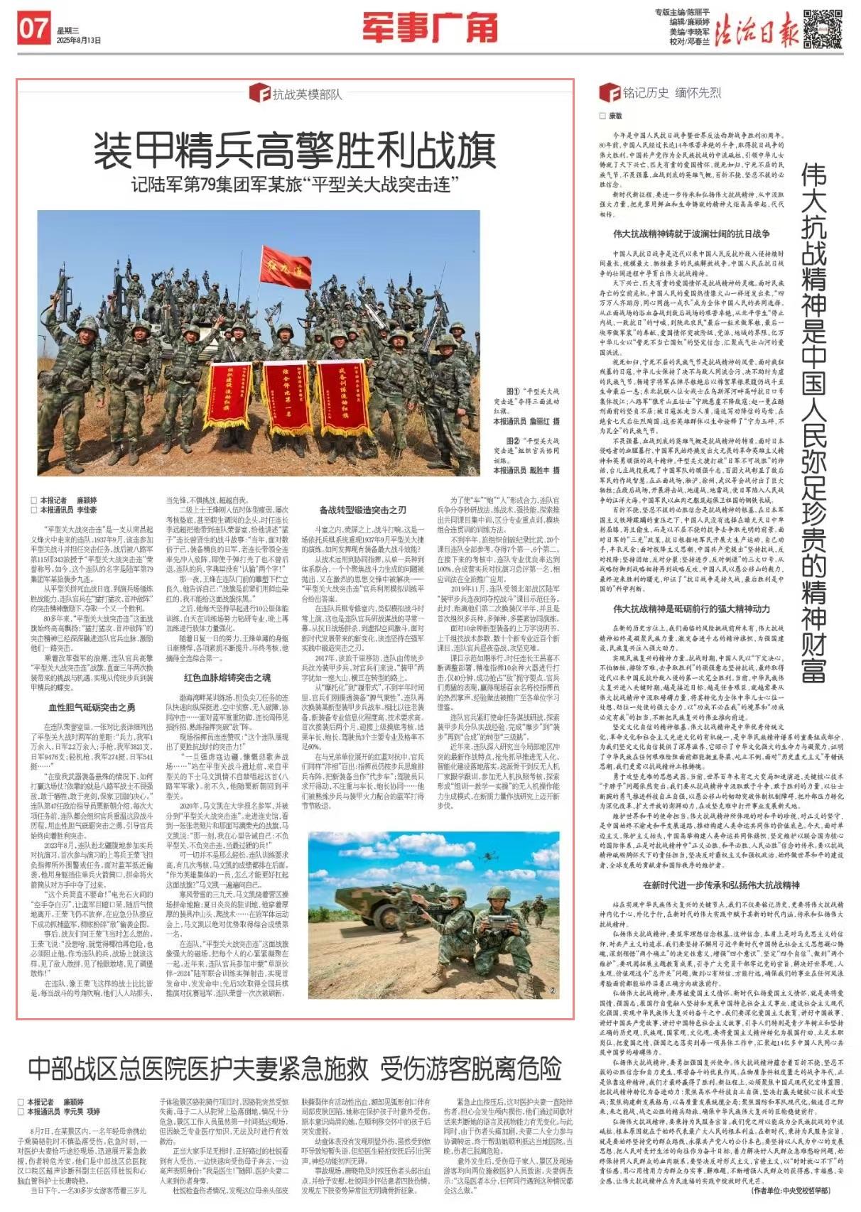 “平型關大戰(zhàn)突擊連”是一支從南昌起義烽火中走來的連隊。1937年9月,該連參加平型關戰(zhàn)斗并擔任突擊任務,戰(zhàn)后被八路軍第115師343旅授予“平型關大戰(zhàn)突擊連”榮譽稱號。如今,這個連隊的名字是陸軍第79集團軍某旅裝步九連。