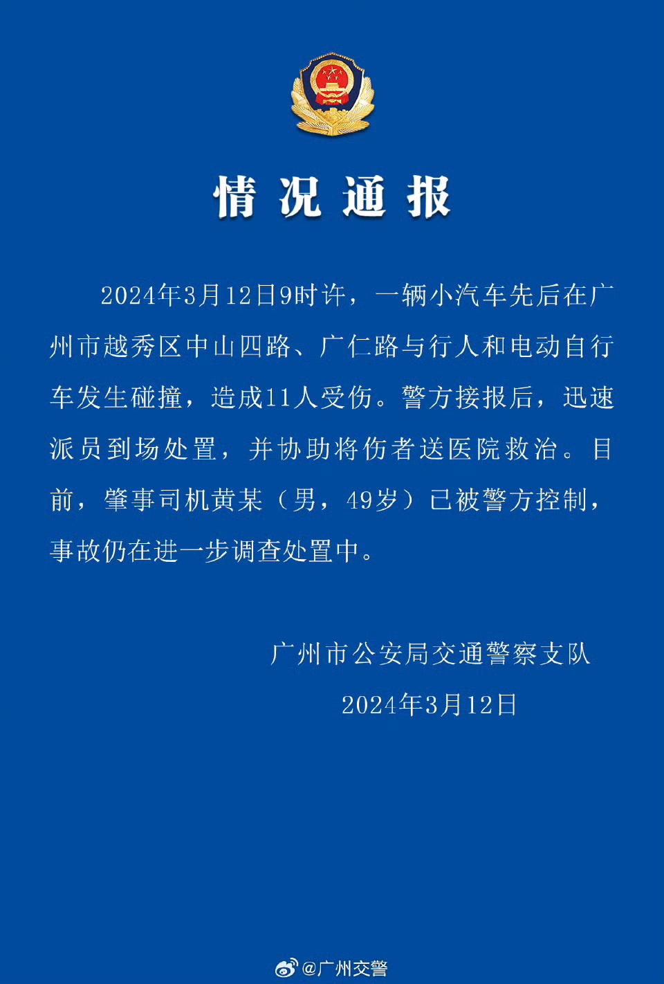據(jù)“廣州交警”官方微博通報(bào),3月12日9時(shí)許,一輛小汽車先后在廣州市越秀區(qū)中山四路、廣仁路與行人和電動(dòng)自行車發(fā)生碰撞,造成11人受傷。警方接報(bào)后,迅速派員到場(chǎng)處置,并協(xié)助將傷者送醫(yī)院救治。目前,肇事司機(jī)黃某(男,49歲)已被警方控制,事故仍在進(jìn)一步調(diào)查處置中。