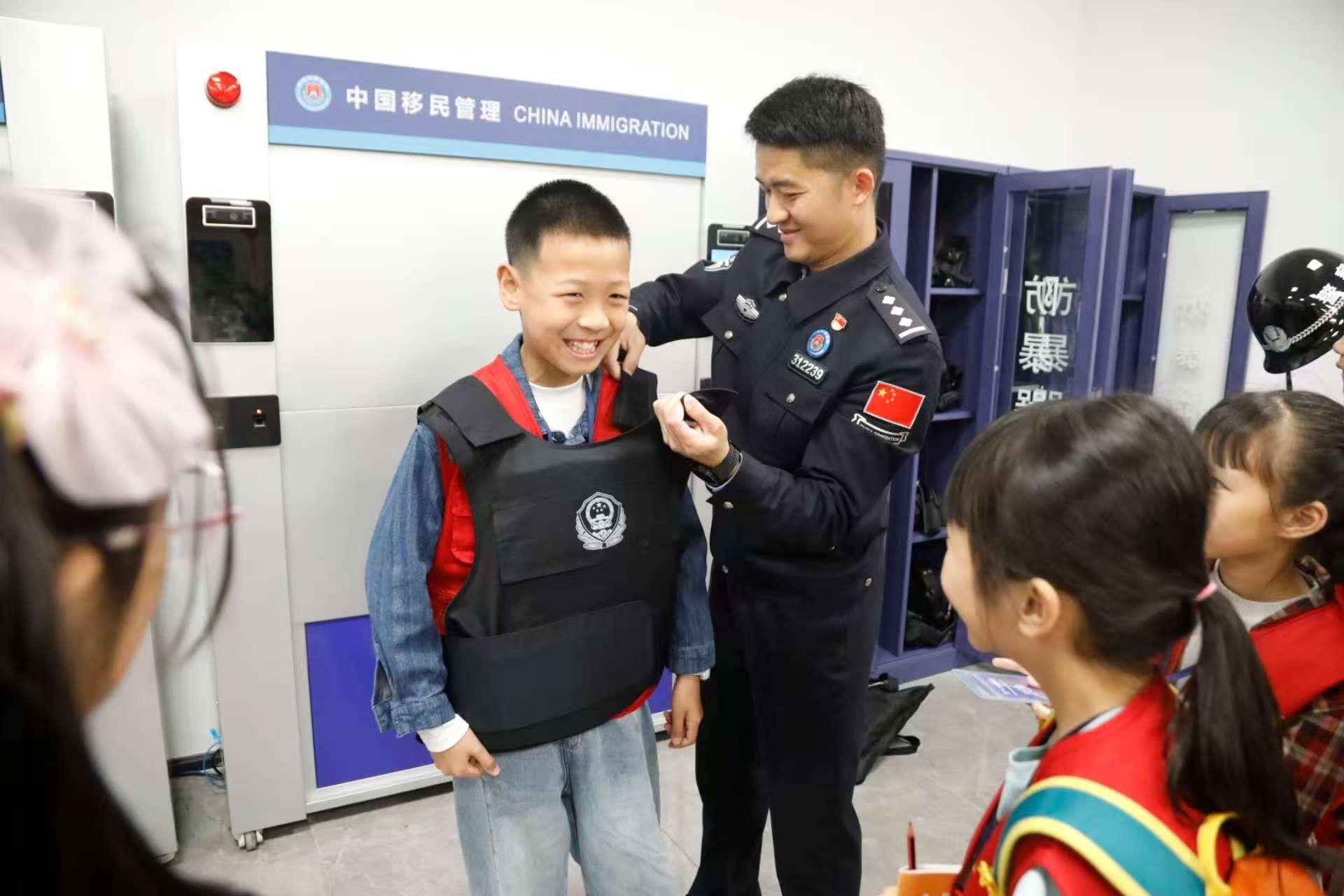 小學(xué)生們在移民管理警察的帶領(lǐng)下,先后參觀了新口岸出境大廳、碼頭泊位及入境大廳,現(xiàn)場體驗(yàn)穿戴警用裝備。