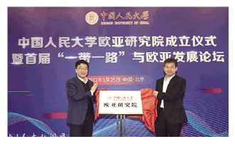 1月25日,中國(guó)人民大學(xué)歐亞研究院成立儀式暨首屆“一帶一路”與歐亞發(fā)展論壇召開(kāi)。中國(guó)人民大學(xué)校長(zhǎng)劉偉、黨委副書記鄭水泉、副校長(zhǎng)劉元春,中國(guó)國(guó)際文化交流中心秘書長(zhǎng)許紅海,中國(guó)社會(huì)科學(xué)院俄羅斯東歐中亞研究所所長(zhǎng)孫壯志,北京大學(xué)區(qū)域與國(guó)別研究院副院長(zhǎng)、國(guó)際關(guān)系學(xué)院教授翟崑,清華大學(xué)戰(zhàn)略與安全研究中心主任、社科院教授達(dá)巍,上海合作組織研究中心秘書長(zhǎng)、中國(guó)國(guó)際問(wèn)題研究院研究員鄧浩,民盟中央副主席、中國(guó)人民大學(xué)教授鄭功成以及有關(guān)部委司局級(jí)領(lǐng)導(dǎo)、學(xué)校相關(guān)單位負(fù)責(zé)人、專家學(xué)者共60余人出席成立儀式暨論壇開(kāi)幕式。