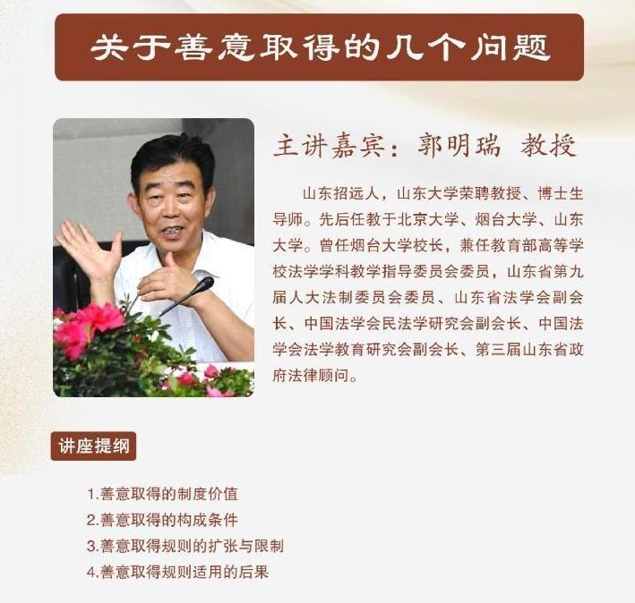 中國石油大學(華東)第八期 “石大人文講壇”邀請中國法學會民法學研究會副會長,煙臺大學原校長郭明瑞教授圍繞“關(guān)于善意取得的幾個問題”,將于4月15日在中國石油大學(華東)逸夫樓一樓報告廳開講。