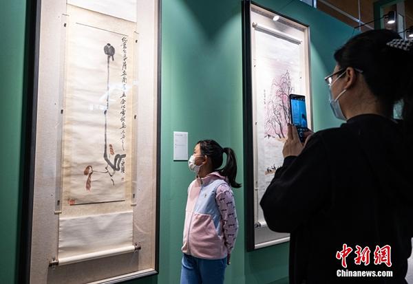 4月13日,市民在北京榮寶齋欣賞在此舉辦的“南張北齊——張大千齊白石書畫藝術特展”。本次特展精選張大千與齊白石一生早、中、晚三個時期,近五十件(組)佳作,完整地涵蓋了兩位世紀巨匠各個時期的創(chuàng)作面貌。圖為家長帶小朋友參觀齊白石《仿八大山人鳥木圖》。中新社記者 侯宇 攝