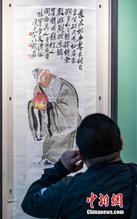 4月13日,市民在北京榮寶齋欣賞在此舉辦的“南張北齊——張大千齊白石書畫藝術特展”。本次特展精選張大千與齊白石一生早、中、晚三個時期,近五十件(組)佳作,完整地涵蓋了兩位世紀巨匠各個時期的創(chuàng)作面貌。圖為齊白石《東方朔盜桃圖》吸引一位男士駐足欣賞。中新社記者 侯宇 攝