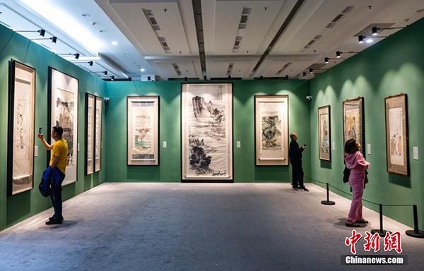 4月13日,市民在北京榮寶齋欣賞在此舉辦的“南張北齊——張大千齊白石書畫藝術特展”。本次特展精選張大千與齊白石一生早、中、晚三個時期,近五十件(組)佳作,完整地涵蓋了兩位世紀巨匠各個時期的創(chuàng)作面貌。圖為觀眾參觀齊白石《梅石圖》《荔枝圖》(左一、左二)和張大千《夏山高隱圖》《峨眉接引殿》(右二、右一)。中新社記者 侯宇 攝