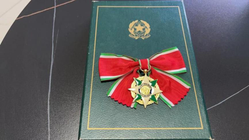 (意大利總統(tǒng)向費安玲頒發(fā)的“意大利共和國騎士勛章”及證書。說明:證書中的“ANLIN FEI”應(yīng)為“ANLING FEI”。)