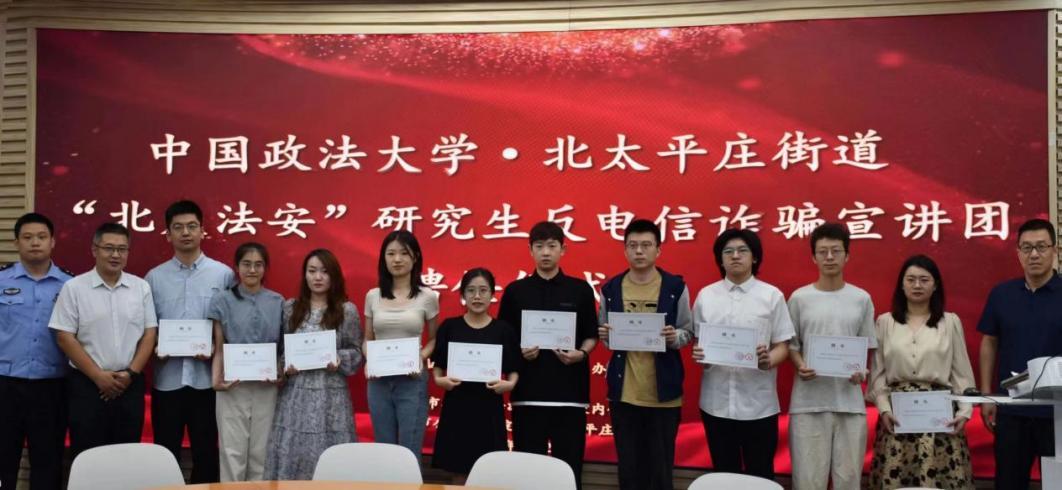 為進(jìn)一步加強(qiáng)與完善研究生社會(huì)實(shí)踐育人體系,引導(dǎo)和鼓勵(lì)中國(guó)政法大學(xué)研究生發(fā)揮專(zhuān)業(yè)優(yōu)勢(shì),深入基層實(shí)踐,服務(wù)基層法治建設(shè),今年3月,中國(guó)政法大學(xué)研究生工作辦公室、刑事司法學(xué)院聯(lián)合北京市公安局海淀分局北太平莊派出所共同組建“北太法安”中國(guó)政法大學(xué)研究生反電信詐騙宣講團(tuán)。6月28日,"北太法安"研究生反電信詐騙宣講團(tuán)聘任儀式在中國(guó)政法大學(xué)學(xué)院路校區(qū)舉行。