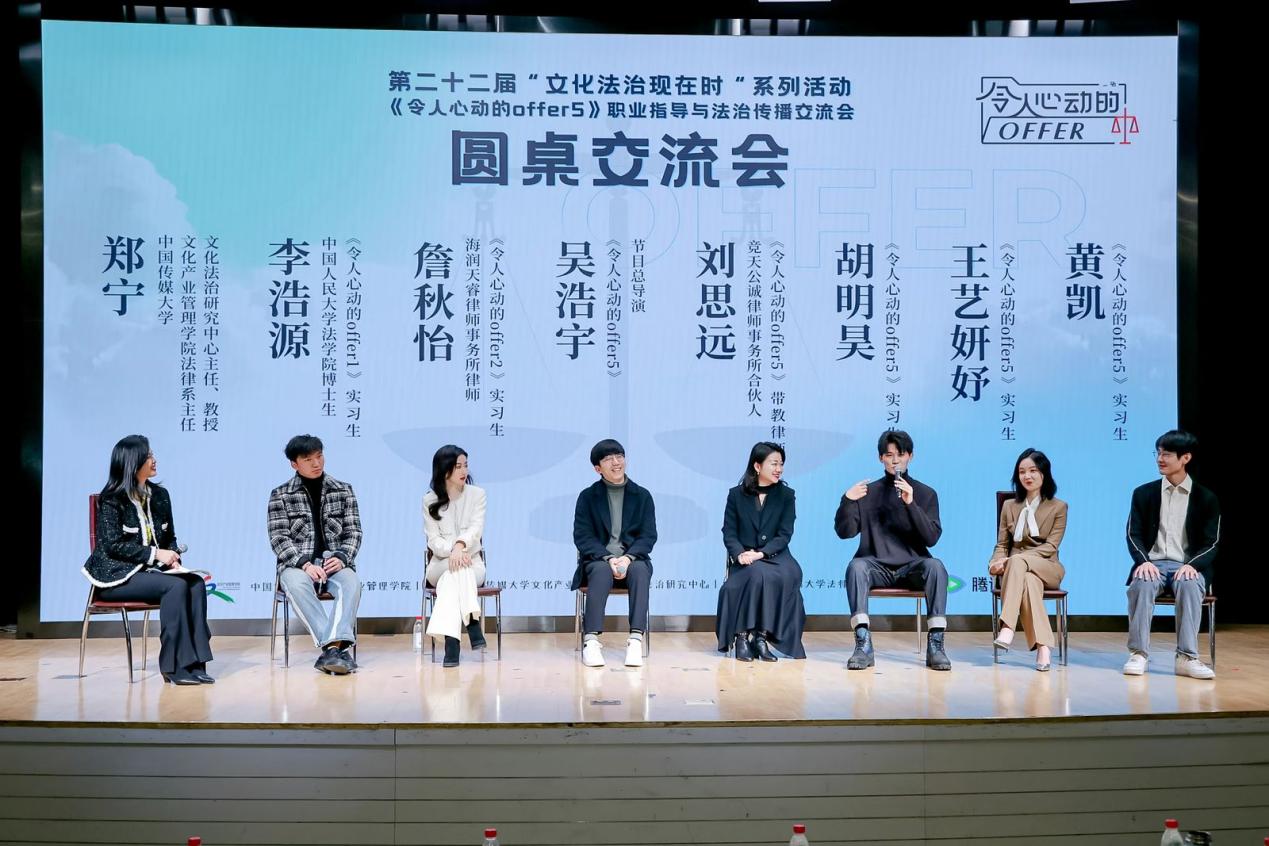圓桌交流環(huán)節(jié)由中國傳媒大學文化產(chǎn)業(yè)管理學院法律系主任、文化法治研究中心主任鄭寧主持。與會嘉賓圍繞參加節(jié)目的收獲、個人選擇和成長的心路歷程、如何提升職場競爭力、對在校生的求職建議以及如何打造職場觀察類綜藝節(jié)目等話題進行了交流分享,就《令人心動的offer5》的社會價值、求職經(jīng)驗、如何提升自身能力等話題為同學們答疑解惑,并提出務(wù)實建議。