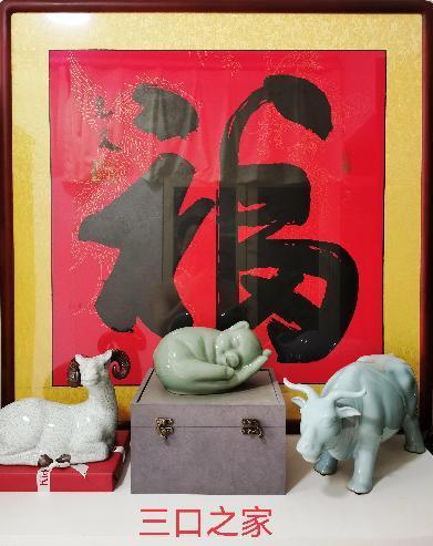 毫無疑問,正是這件作品隱含的濃烈親情元素和快樂因子,深深吸引并打動(dòng)了我,才最終成全了這筆交易,甚至讓我一不做二不休,干脆還買下了自己和夫人的生肖作品——羊和牛。返京后,我們將這三件清一色吃素的屬相工藝品,和家中原有的一幅大紅“?!弊?jǐn)[在一起,便組合出一幅別有情趣的“和諧家園風(fēng)景圖”:幸福一家人、快樂一家親。