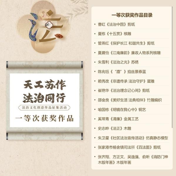 為深入實施蘇州市“八五”普法規(guī)劃,推動法治文化與非物質(zhì)文化遺產(chǎn)深度融合發(fā)展,今年,江蘇省蘇州市委宣傳部、蘇州市司法局、蘇州市文化廣電和旅游局、蘇州市文學(xué)藝術(shù)界聯(lián)合會以“天工蘇作 法治同行”為主題在全市開展了法治文化創(chuàng)意作品征集活動,積極探索創(chuàng)新法治宣傳形式,讓法治精神和法治信仰深入人心。