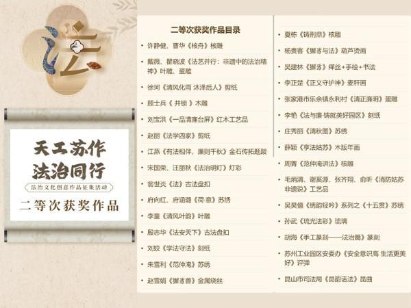 作品征集過程中,蘇州一大批非遺文化傳承人、手工藝人、法治文化愛好者等圍繞法治主題,創(chuàng)作出了形式多樣的法治文化創(chuàng)意作品,蘇繡、核雕、剪紙、緙絲、木雕等集思想性、藝術(shù)性、教育性于一體的高品質(zhì)法治文化創(chuàng)意作品競相涌現(xiàn)。