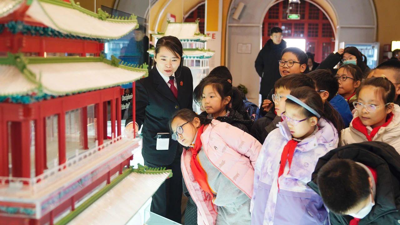 圖為學(xué)生們?cè)诜ü俚膸ьI(lǐng)下參觀鐘鼓樓。 賈小藝 攝