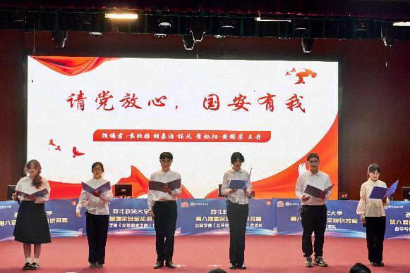 西北政法大學(xué)第八屆國家安全知識競賽于今年3月正式拉開帷幕。4月10日,本屆知識競賽決賽在長安校區(qū)滿天星學(xué)術(shù)報告廳圓滿舉行。素養(yǎng)展示環(huán)節(jié),法治宣講團(tuán)成員以“請黨放心,強(qiáng)國有我”為題進(jìn)行宣講展示。