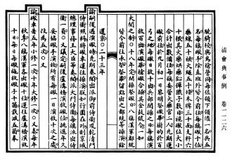 “事例”原指先前存在的成例。在中國古代,事例對(duì)后發(fā)類案之處置,多具指導(dǎo)意義。西晉時(shí),楊駿以謀反之罪見誅,其弟楊珧雖陳情自告仍受牽連。“當(dāng)時(shí)皆謂宜為申理,合依鐘繇事例”,時(shí)人援引鐘繇免于鐘會(huì)之誅事,欲援救楊珧。逮至明代,“事例”已表現(xiàn)出與會(huì)典的密切聯(lián)系。《萬歷會(huì)典》載,“其近年六部等衙門見行事例,各令選委司屬官,遵照體例,分類編集”。洎乎清代,“會(huì)典事例”作為一種法律形式繼續(xù)發(fā)展?!犊滴鯐?huì)典》率先厘定“事例”的類型。乾隆時(shí),認(rèn)為“夫例可通,典不可變”,典與例當(dāng)分離。遂在制定《大清會(huì)典》之余,另編《大清會(huì)典則例》180卷。嘉慶朝在編纂《大清會(huì)典》之外,又有《大清會(huì)典事例》920卷、《欽定大清會(huì)典圖》132卷。至此,“會(huì)典事例”以一種法律形式獨(dú)立于“會(huì)典”存在。