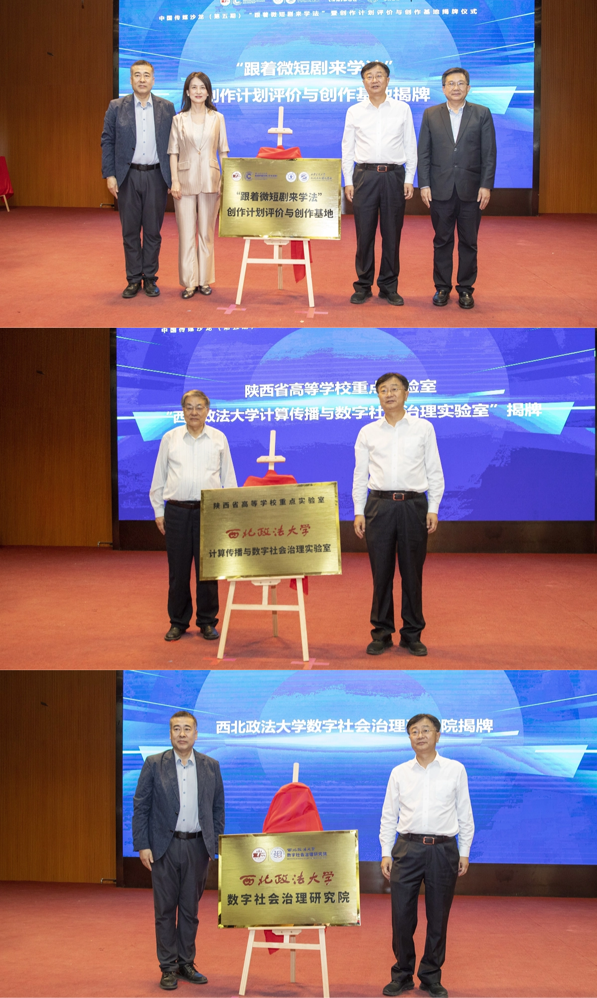 開幕式上,范九利與闞平共同為“跟著微短劇來學法”創(chuàng)作計劃評價與創(chuàng)作基地揭牌。隨后,孫憲忠與范九利為西北政法大學“計算傳播與數字社會治理陜西省高等學校重點實驗室”揭牌,范九利與西北政法大學新聞傳播學院(藝術學院)院長孫江為西北政法大學數字社會治理研究院揭牌。該實驗室及研究院將持續(xù)整合學校內外法學、新聞傳播學與計算機科學資源,探索AI劇本生成、虛擬庭審場景等技術應用,為普法宣傳提供技術支撐。