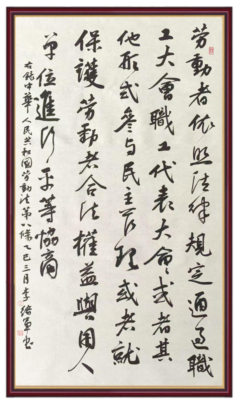 法律,是勞動(dòng)者披荊斬棘的鎧甲;書法,是法治精神薪火相傳的載體。