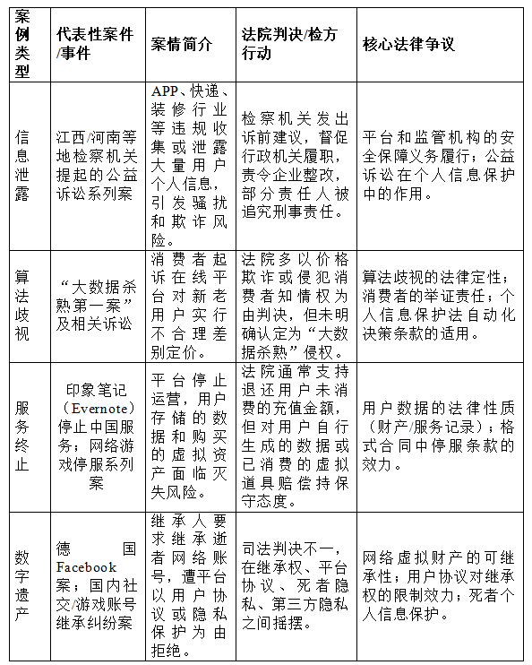 本文立足于司法實(shí)踐的視角,對(duì)大規(guī)模個(gè)人信息處理在我國(guó)引發(fā)的系統(tǒng)性法律風(fēng)險(xiǎn)及其治理路徑進(jìn)行了系統(tǒng)性考察。研究表明,隨著數(shù)字經(jīng)濟(jì)的深化,相關(guān)風(fēng)險(xiǎn)已超越了傳統(tǒng)的個(gè)人隱私侵權(quán)范疇,演化為關(guān)乎數(shù)據(jù)安全與可用性、權(quán)利行使與平臺(tái)責(zé)任平衡,以及對(duì)既有法律概念體系沖擊的三個(gè)核心維度。通過(guò)對(duì)檢察公益訴訟、算法歧視、服務(wù)終止和數(shù)字遺產(chǎn)四類(lèi)典型案例的深度剖析。
