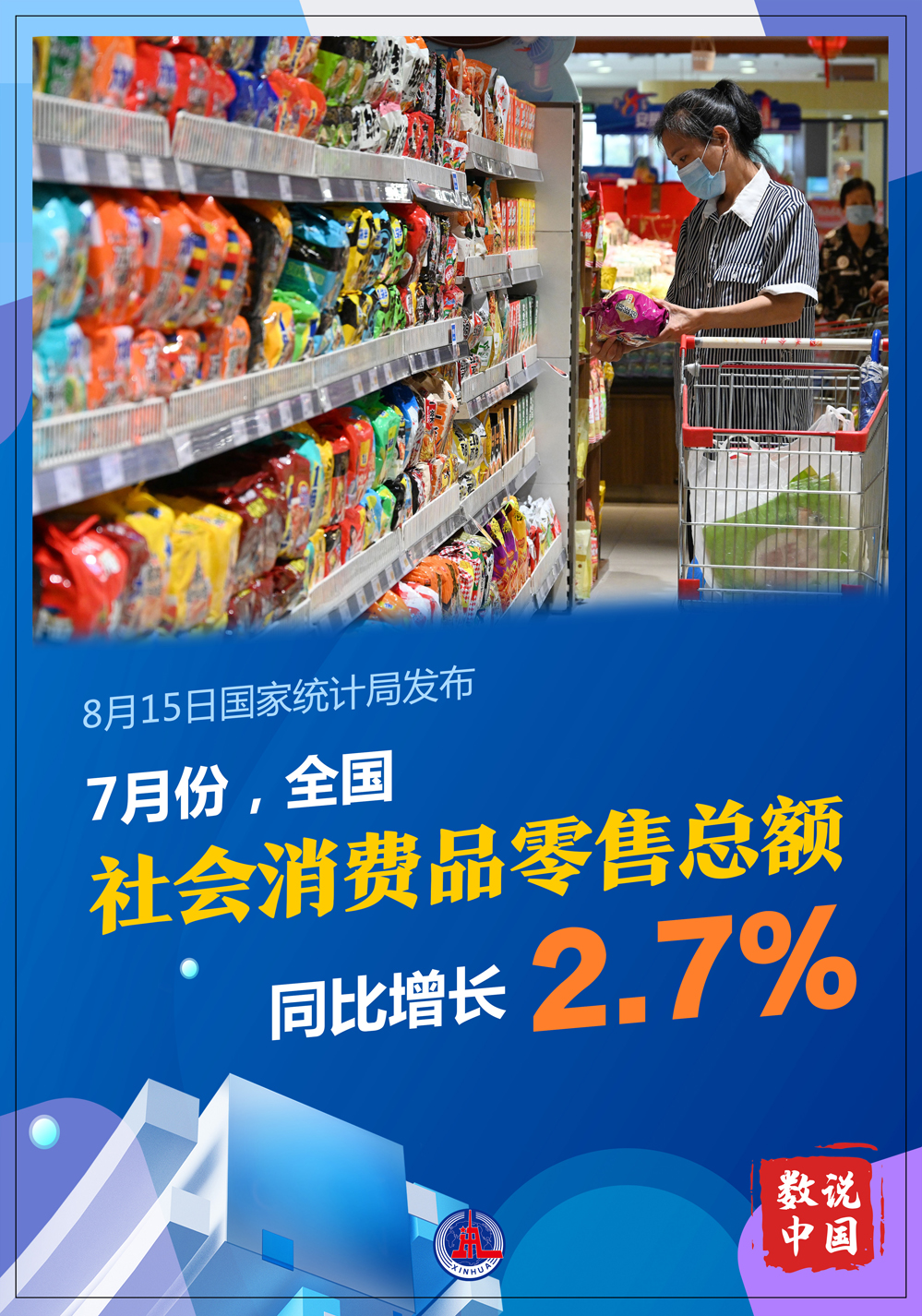國家統(tǒng)計(jì)局8月15日發(fā)布數(shù)據(jù)顯示,7月份,社會消費(fèi)品零售總額同比增長2.7%,比上月回落0.4個百分點(diǎn);環(huán)比增長0.27%。