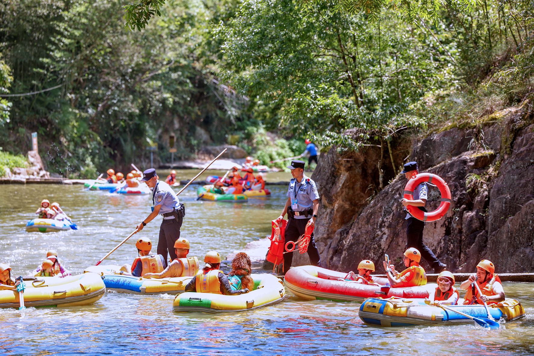 7月24日,安徽省廣德市公安局四合派出所民輔警走進(jìn)轄區(qū)響水關(guān)探險(xiǎn)漂流點(diǎn),現(xiàn)場(chǎng)向游客講解防溺水安全知識(shí)。