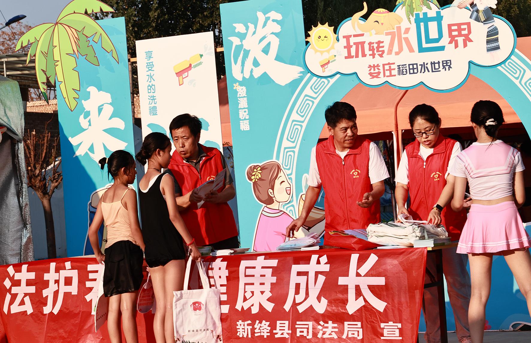 7月28日,山西省運城市新絳縣司法局“法護春苗 健康成長”暑假普法小分隊在婁莊村稻田小鎮(zhèn)水世界為中小學生普及未成年人保護法等法律知識。