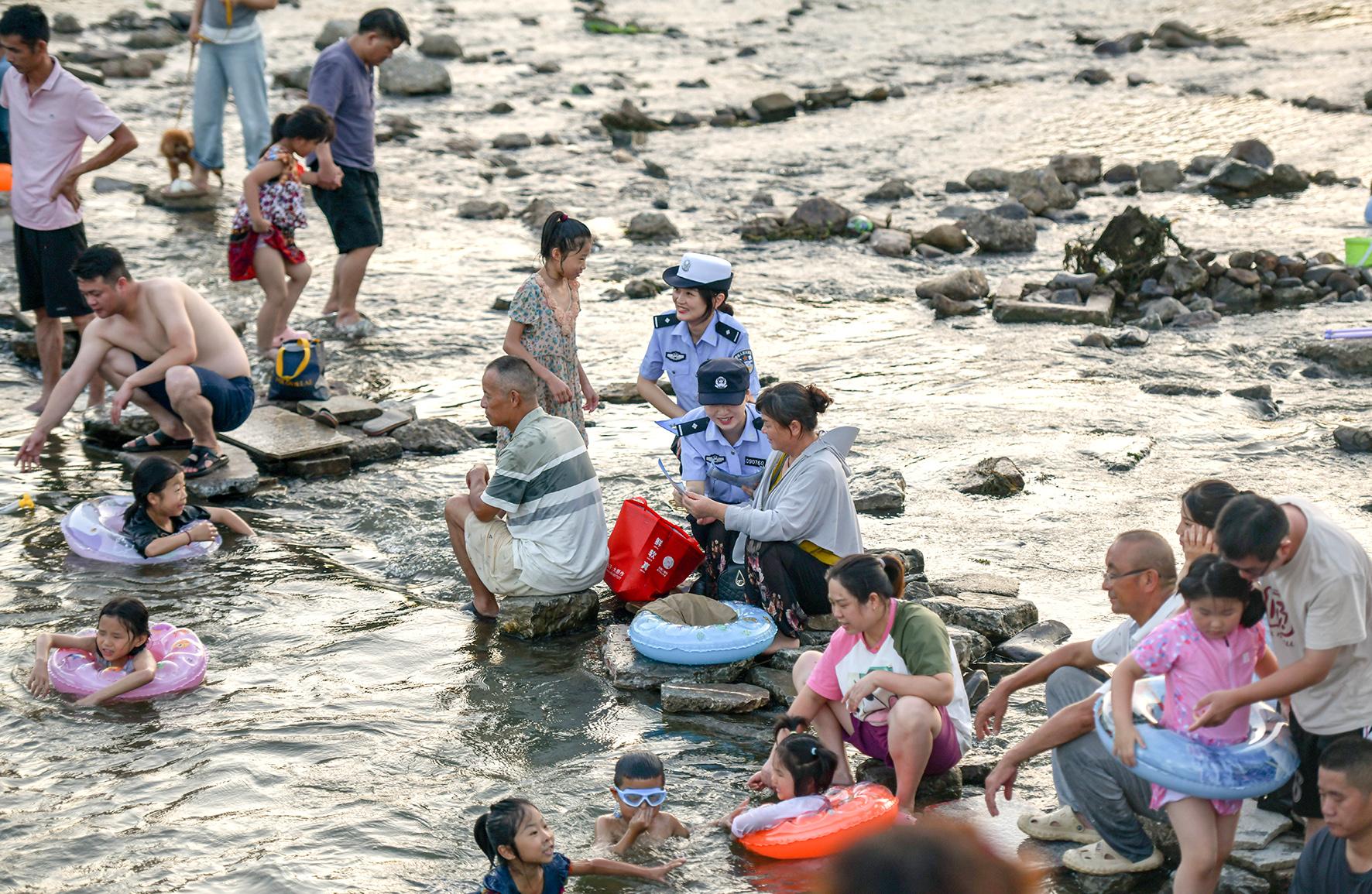 7月29日,安徽省涇縣公安局組織民警前往轄區(qū)河道,向納涼群眾開展防溺水、交通安全知識宣傳。
