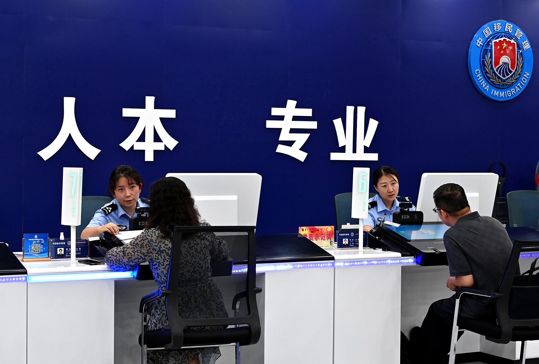 圖為8月1日,蘭州市公安局出入境服務大廳服務窗口正在為群眾辦理相關業(yè)務。