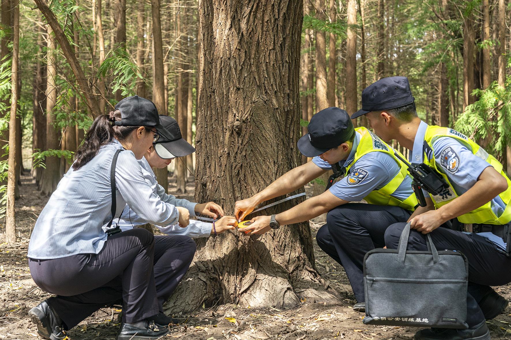 圖3、8月14日,民警與工作人員一同查看濕地內(nèi)樹木的生長狀態(tài)。